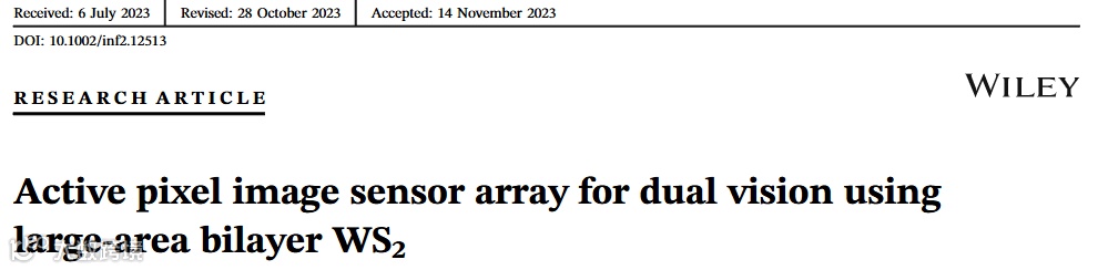 过渡金属二硫族化合物(TMDs)是开发高级传感器的有前途候选材料,尤其适用于车辆、无人机和安全监控的昼夜视系统。传统系统依赖于不同光照条件下的独立传感器,而TMDs可以吸收宽光谱范围内的光。在本研究中,实现了基于双层WS2光晶体管的双视觉有源像素图像传感器阵列。通过射频溅射和化学气相沉积相结合的工艺合成了双层WS2薄膜。基于WS2的薄膜晶体管(TFTs)表现出高平均迁移率、优异的Ion/Ioff比和均匀的电学特性。TFTs阵列的光电特性表现出一致的行为,可以检测从可见光到近红外光,由于光栅效应,在405 nm波长下具有最高的响应度(1821 A W−1)。最后,展示了利用光模板投影的有源像素图像传感器阵列的红、绿、蓝和近红外图像感测能力。所提出的利用WS2光晶体管的图像传感器阵列有望在视觉传感领域带来革命性变化,从而在包括夜视、行人检测、各种监控和安全系统等各个应用领域带来新的机遇。