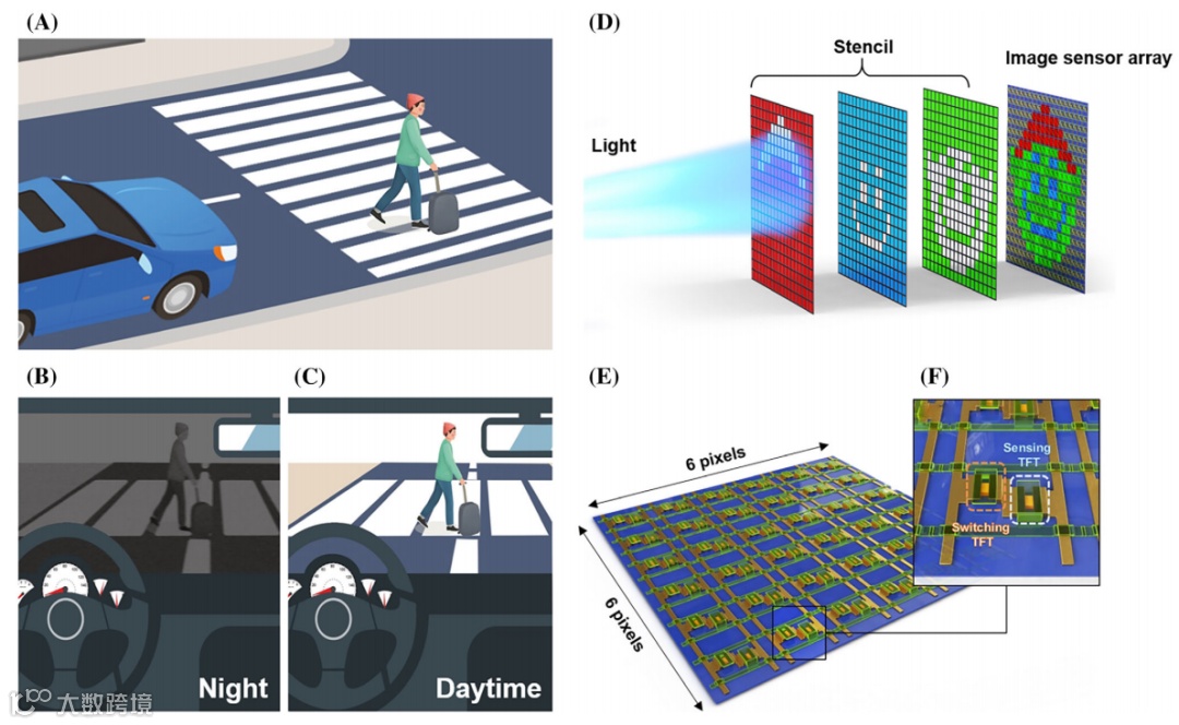 图1 双视觉图像传感器的概念化。(A–C)分别使用 NIR 和 RGB 光谱的夜间和白天视觉示意图。(D)通过在图像传感器阵列上进行光模板投影来捕获图像的概念。(E)6 × 6 图像传感器阵列的示意图,插图(F)显示了由一个不透明顶部栅极开关和透明顶部栅极传感晶体管组成的单像素架构。