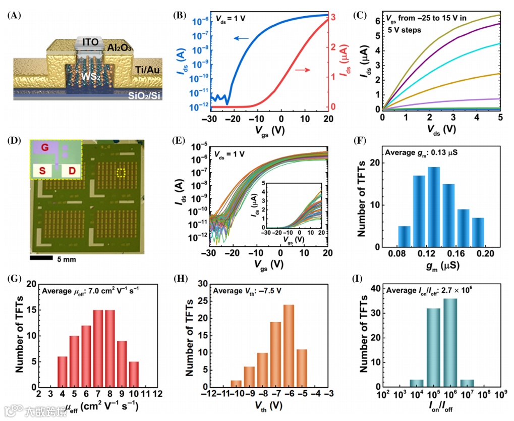 图3 WS2晶体管的电气特性。(A)tog-gate WS2 TFT 架构示意图。(B)单个 WS2 TFT 的I ds – V gs (传输曲线)曲线,以对数刻度(蓝线)和线性刻度(红线)表示。(C)单个 WS2 TFT的I ds – V ds(输出曲线)曲线, V gs = −25 至 15 V,步长为 5 V。(D)大面积 WS2 TFT 阵列和插图描绘了单个器件的光学显微图像。(E)72 个 TFT 的传输特性(以对数刻度图表示),插图显示线性刻度图。(F)72 个 TFT 的最大g m值。(G) μ eff、(H)V th和(I)I on / I off的统计数据。平均μ eff、V th和I on / I off分别为7.0 cm 2 V −1 s −1、−7.5 V和2.7 × 10 6。
