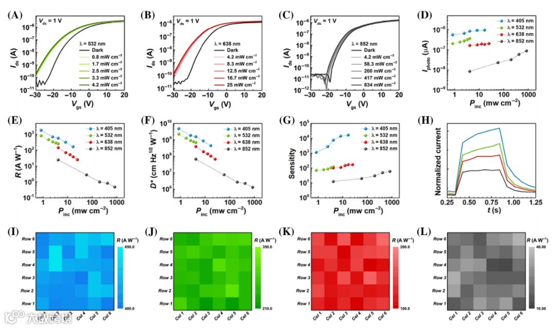 在本研究中,我们介绍了一种基于集成开关晶体管的双层 WS2光电晶体管的双视觉有源像素图像传感器阵列。双层 WS2薄膜采用射频 (RF) 溅射和 CVD 相结合的工艺合成。通过引入 H2S 作为硫前体,利用硫气体层流在大面积基板上生长WS2。使用各种光谱和微观分析证实了高均匀性和良好的结晶性能。基于 WS2的薄膜晶体管 (TFT) 表现出 7.7 cm 2 V −1 s −1的高平均迁移率、~10 6的优异I on / I off以及高度均匀的电气性能。此外,WS2 TFT 阵列表现出均匀的光电特性,并且可以检测可见光至近红外 (NIR) 光,得益于光电门控 (PG) 效应,其最高响应度为 1821 A W −1(波长为 405 nm)。最后,我们利用光模板投影展示了有源像素图像传感器阵列的红、绿、蓝 (RGB) 和 NIR 图像感应功能。演示的图像传感器阵列可用于昼夜视觉、行人检测、图像感应、人工智能等。我们相信,使用 WS2光电晶体管的图像感应有可能彻底改变视觉感应领域,并为自动驾驶汽车、监控和安全系统等一系列应用开辟新的机遇。