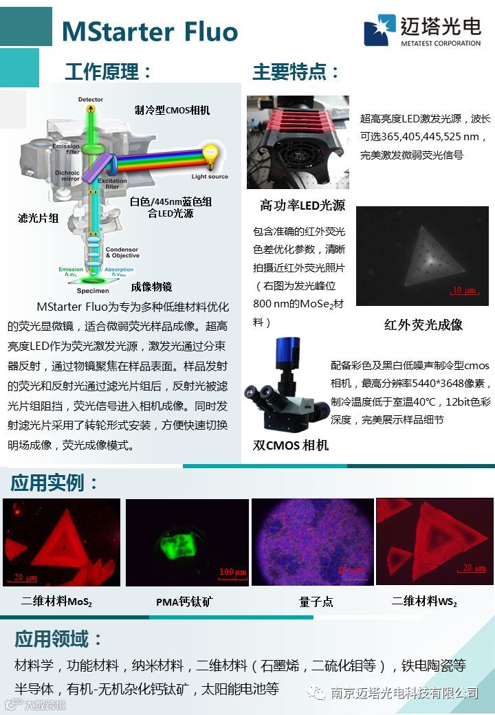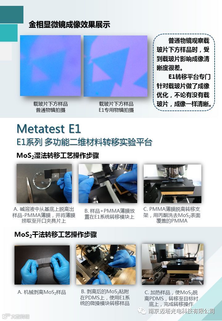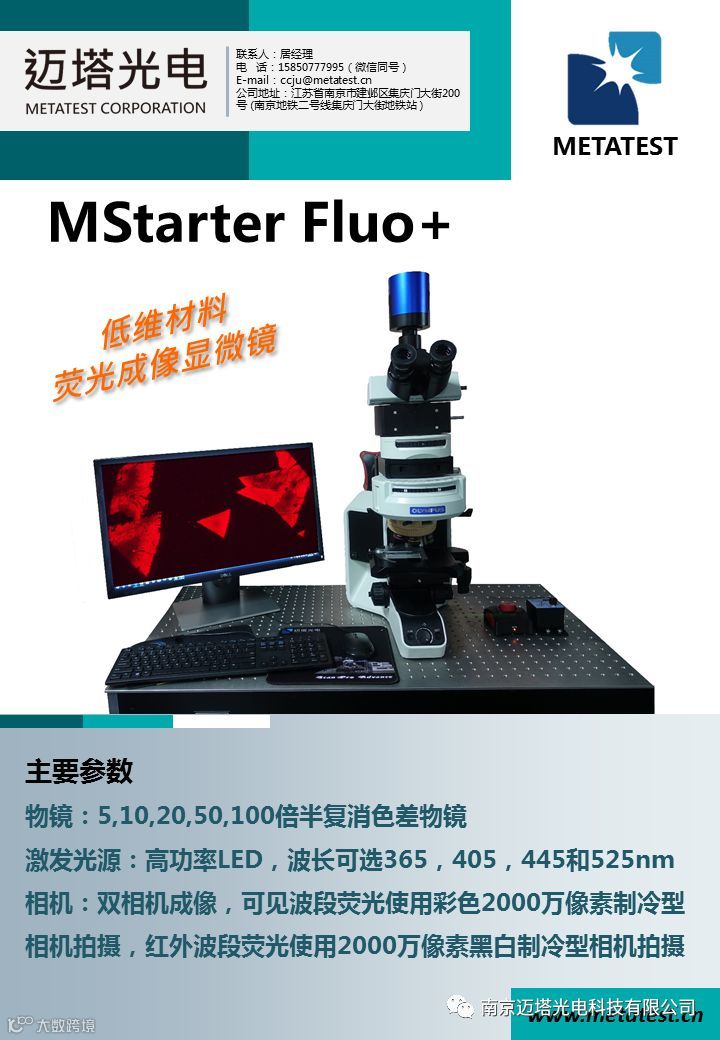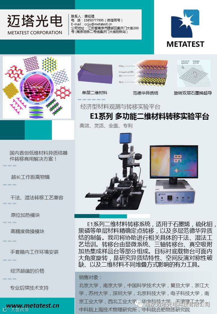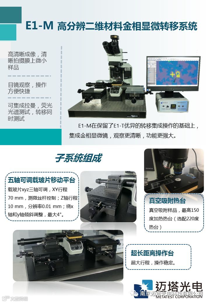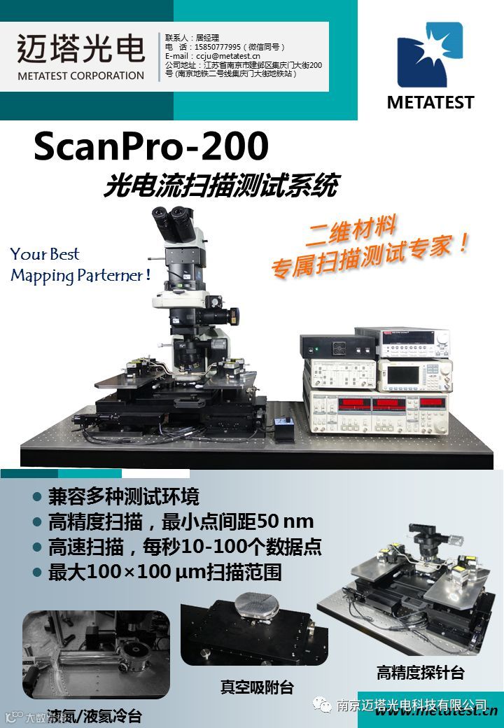 南京迈塔光电科技有限公司将作为参展商参加本届低维材料应用与标准研讨会。本次参展的仪器有:E1系列多功能二维材料转移实验平台、MStarter Fluo+低维材料荧光成像显微镜、ScanPro-100共聚焦光谱扫描系统、ScanPro-200光电流扫描测试系统。详情如下: