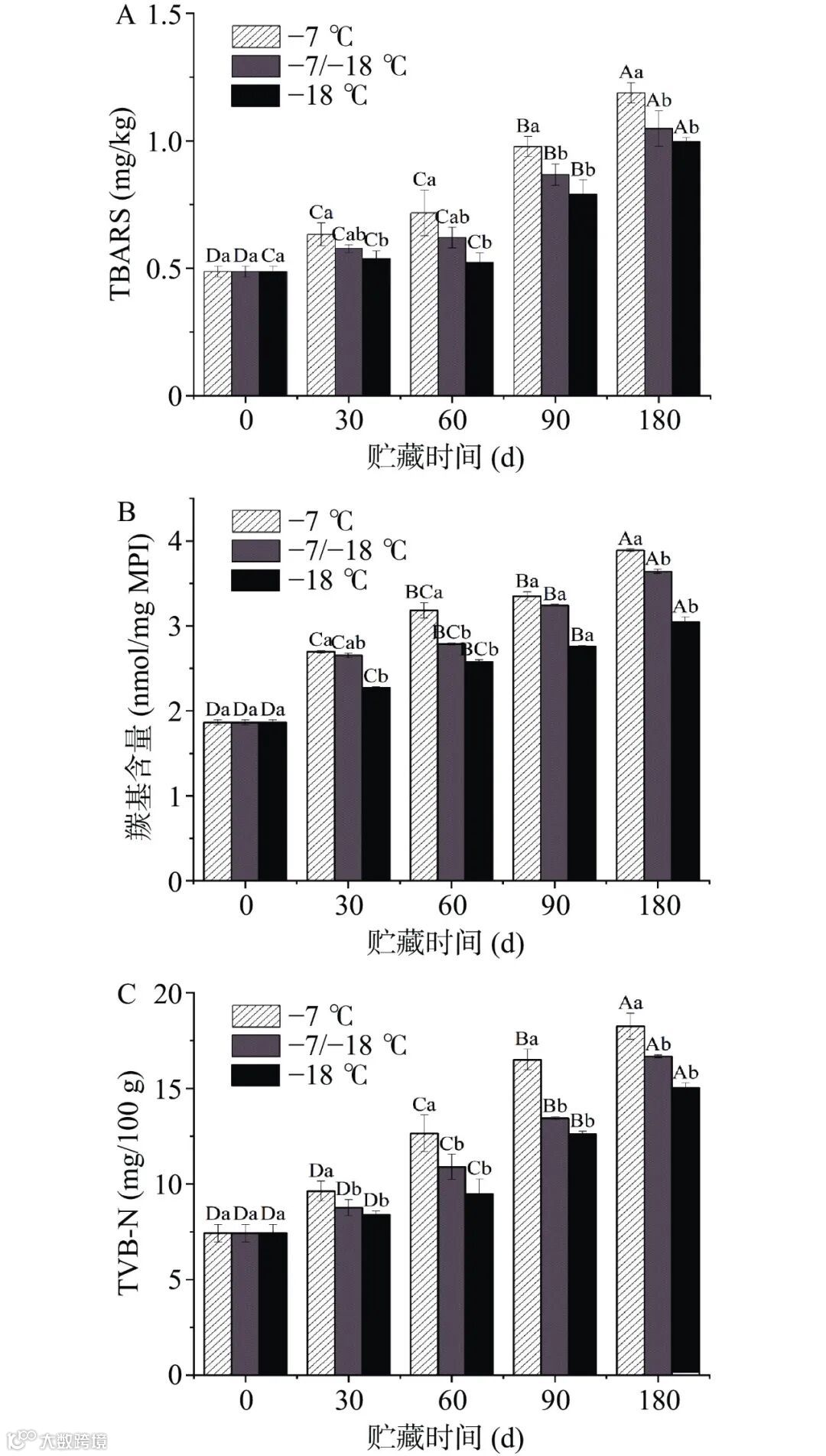 为阐明冷冻鱼肉水饺在贮藏、运输及零售过程中的品质变化情况与内在作用机制,本试验将水饺分别放置于−7 ℃(模拟零售温度)、−7/−18 ℃(模拟运输温度及昼夜温度波动)和−18 ℃(冻藏温度)这三种温度条件下进行冻藏。结果表明,相较于处于−7 ℃以及经历−7/−18 ℃温度波动的水饺样品,在−18 ℃条件下冻藏的样品,其蒸煮损失的上升幅度明显更小。值得关注的是,在冷冻贮藏期间,水饺内的脂质与蛋白质氧化程度显著加剧,具体体现为样品中的TBARS值和羰基含量均随贮藏时间的延长而不断增加,且零售过程与运输过程或昼夜温度变化都会加剧脂质与蛋白质氧化。生物胺检测结果显示,在冻藏的鱼肉水饺中所检测出的六种生物胺含量,均随冻藏时间的延长而显著上升。对鱼肉水饺开展感官评价时发现,−7 ℃和−7/−18 ℃处理组的样品,其质地和多汁性明显恶化,酸败程度也有所加重。结合相关性分析结果可知,在零售温度−7 ℃与温度波动−7/−18 ℃存放90 d的鱼肉水饺,其品质与在冷冻贮藏−18 ℃下贮藏180 d的水饺样品品质相近。综上所述,在鱼肉水饺的零售与运输过程中,务必维持较低温度,并营造更为稳定的环境条件,以此延缓水饺在流通过程中的氧化进程,抑制生物胺含量的增加,进而延缓产品感官品质劣变。