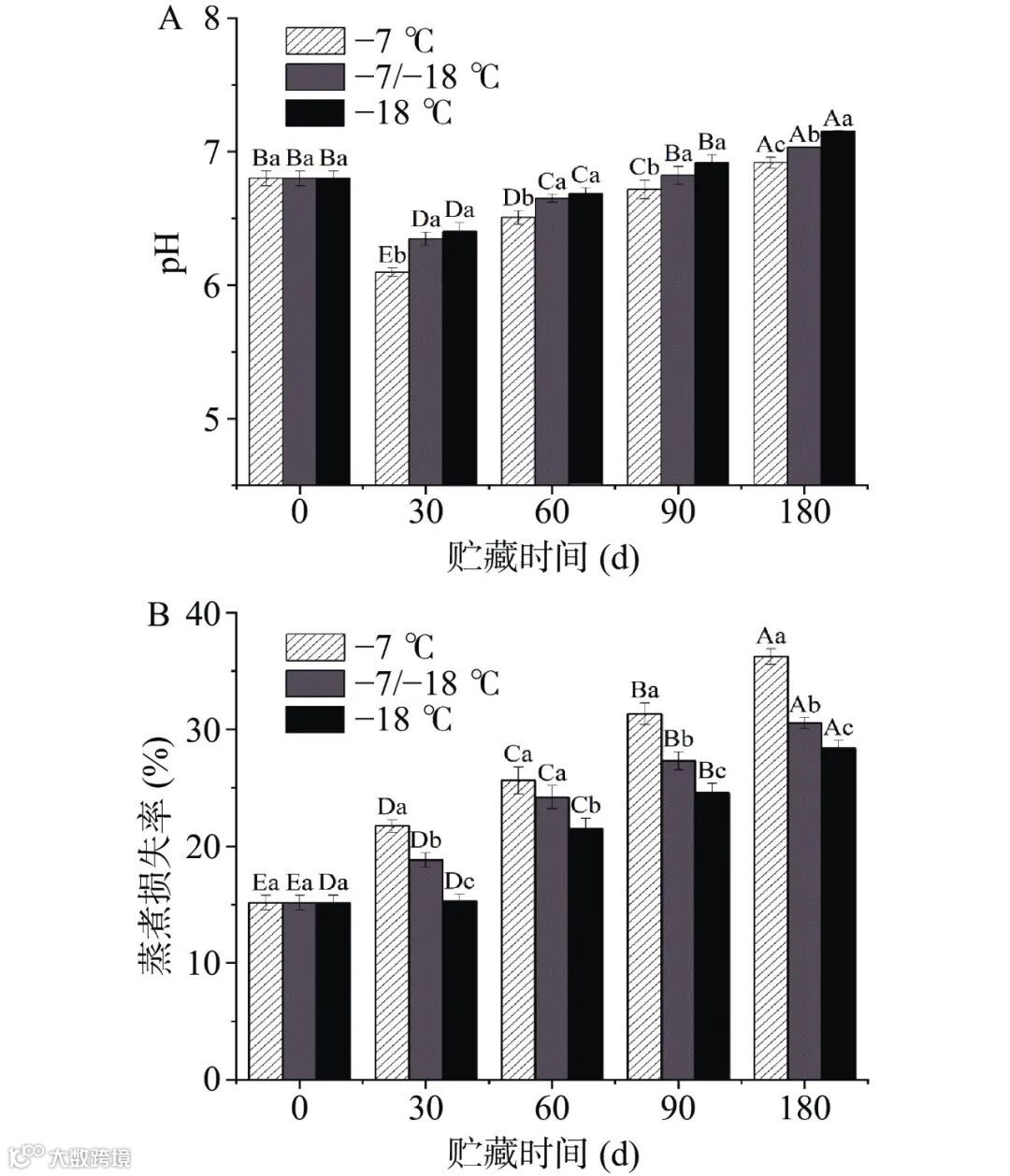 图 1 鱼肉水饺肉馅在冻藏期间的pH(A)和蒸煮损失率(B)的变化