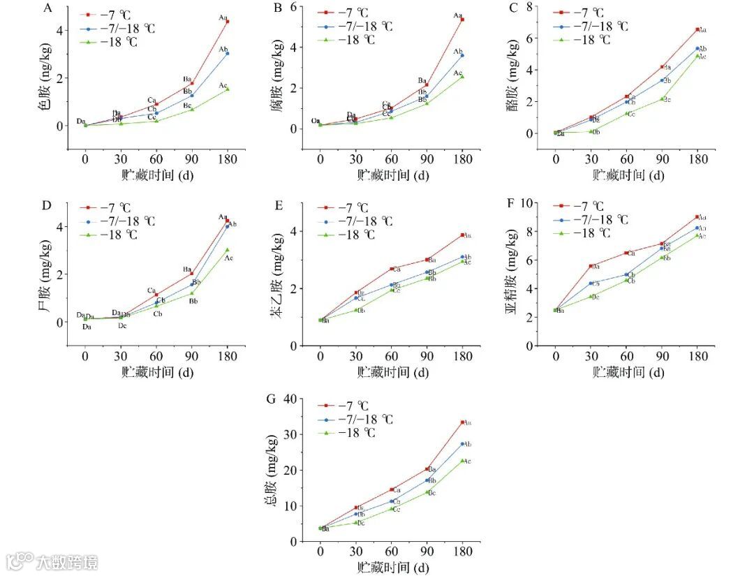 TVB-N可用于评价由细菌和酶引发的蛋白质降解水平。在蛋白质降解过程中,会产生诸如胺和氨等碱性含氮化合物,因而TVB-N含量越高则说明蛋白质降解程度越高,形成的碱性含氮化合物含量越多。如图2C所示,贮藏温度与贮藏时间对TVB-N含量的变化有着显著影响(P<0.05)。TVB-N含量升高说明在冷冻贮藏过程中,随着时间的延长,水饺肉馅中的微生物所产生的蛋白酶和氨基酸脱羧酶持续降解蛋白质,产生了挥发性氨和胺类物质。常娅妮等研究了不同冷冻方式对斑点叉尾鮰鱼冻藏品质的影响,结果也显示了随着贮藏时间的延长TVB-N含量不断上升。根据《鲜、冻动物性水产品》规定,冷冻淡水鱼虾中TVB-N含量超过15 mg/100 g时,便不应流通于市场。贮藏期结束后发现−7/−18 ℃处理组水饺肉馅中的TVB-N较高于−18 ℃处理组,在贮藏结束后其含量为16.68 mg/100 g,已经超过了市场中冷冻鱼肉流通的最高限值。在贮藏的过程中,温度波动的出现破坏了鱼肉肌纤维结构,造成溶酶体数量增加,导致蛋白分解生成氨基酸与肽等物质,同时氨基酸还会进一步降解生成氨与胺类物质,最终表现出TVB-N值逐渐升高。相较于其他两组,−7 ℃处理组中TVB-N含量增加速率更为显著,且在贮藏90 d时,TVB-N含量已经超过了限定标准,为16.50 mg/100 g,而当贮藏期结束后TVB-N值达到18.25 mg/100 g,超出标准的21.67%。因此,在零售温度(−7 ℃)条件下存放的鱼肉水饺,售卖时长不得超过180 d。以上结果说明−7 ℃的销售温度会加速TVB-N的生成,同时促使大量游离氨基酸产生。这些游离氨基酸为氨基酸脱羧反应提供了底物,最终加速了生物胺的生成。这与本试验中生物胺的趋势一致。