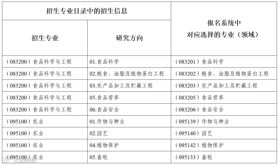 2.我院(0832)食品科学与工程博士学术学位授权点与(0951)农业博士专业学位授权点,2026年均按照一级学科/学位类别进行招生,一级学科/学位类别下设研究方向。在博士报名系统中,根据不同的研究方向,需选择对应的专业(领域)进行报名(见下表):