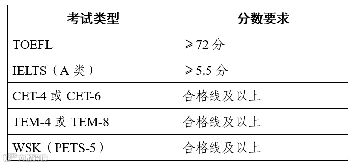 TOEFL、IELTS(A类)、全国大学英语考试(CET-4或CET-6)、国家英语专业考试(TEM-4或TEM-8)、全国外语水平考试(WSK,PETS-5)。