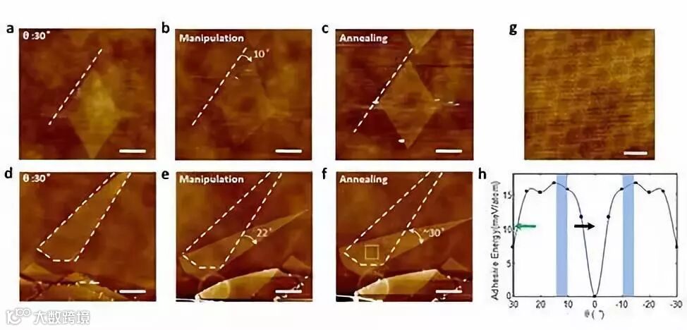 图1a-c, 10度的样品加热旋转到0度。d-e,22度样品加热旋转至30度。g, 零度样品表面出现~15nm周期的摩尔条纹。h第一性原理得到的能量随角度的关系。a-f 的标尺为400nm,g图的标尺为10nm。