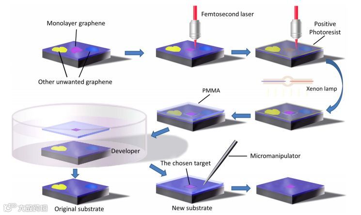 该课题组近年来一直致力于二维材料层间转角的控制和相应结构光电性质的探索和研究,发展了一种对机械剥离石墨烯进行选择性转移和定点转移的新技术,该技术能够将图形化加工的目标石墨烯单独转移到任意位置,而将目标石墨烯周围杂乱无章的石墨碎片留在原基底。