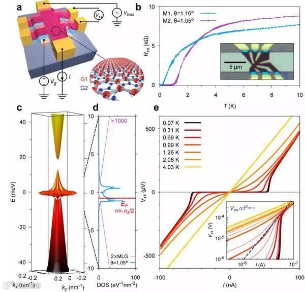 该团队报道了堆叠具有小扭曲角的两个石墨烯片中二维超晶格,产生一种全新的电子态——超导态。当旋转角度小到魔角时(<1.05°),扭曲的双层石墨烯中垂直堆叠的原子区域会形成窄电子能带,电子相互作用效应增强,从而产生非导电的Mott绝缘态。在Mott绝缘态情况下加入少量电荷载流子,就可以成功转变为超导态。