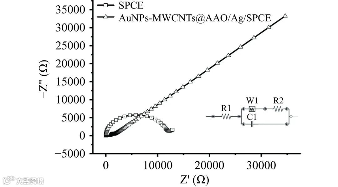 图5为SPCE和AuNPs-MWCNTs@AAO/Ag/SPCE电极在3 mmol/L铁氰化钾溶液中的EIS曲线。SPCE电极具有较大的Rct,修饰了MWCNTs和AuNPs的AuNPs-MWCNTs@AAO/Ag/SPCE电极相比SPCE电极表现出更小的Rct,这与图3中的CV曲线相一致,表明其具有更高的电化学活性和更快的电子转移速率。其中R1代表溶液电阻,R2代表电荷转移电阻,W代表Warburg阻抗,C1代表双电层电容。图谱表明AuNPs和MWCNTs的联合修饰显著降低了电极的电荷转移电阻,提升了电化学性能。