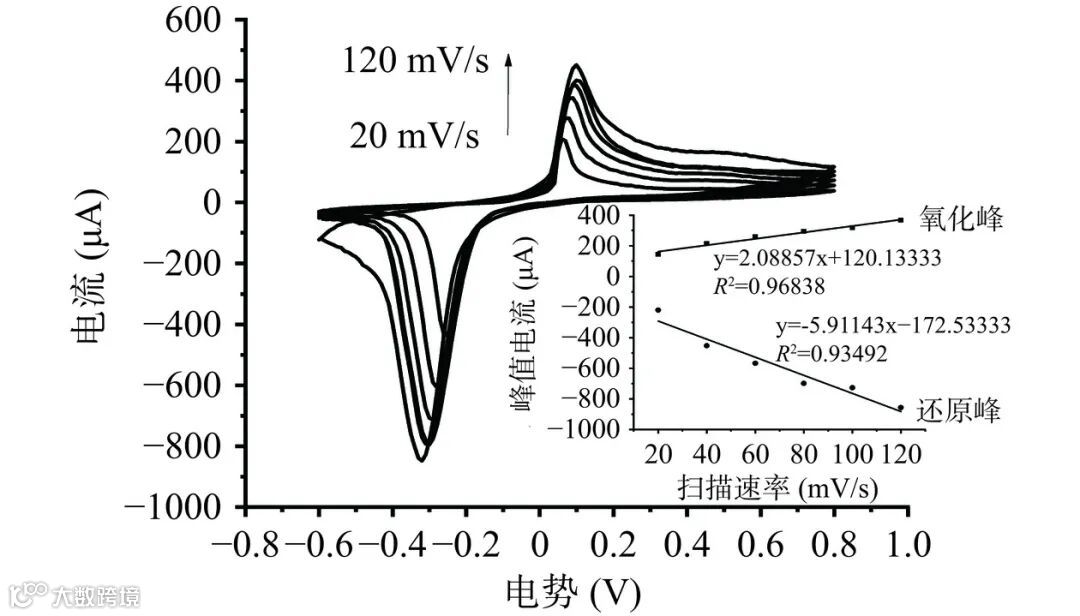 图4展示了不同扫描速率(20、40、60、80、100和120 mV/s)下AuNPs-MWCNTs@AAO/Ag/SPCE电极的CV曲线。随着扫描速率的增加,氧化峰和还原峰的电流显著上升,表明该电极在高扫描速率下具有良好的电化学响应。这符合扩散控制电极过程的典型特征。