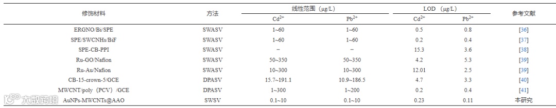 表 1 AuNPs-MWCNTs@AAO/Ag/SPCE电极与其它电化学检测方法比较
