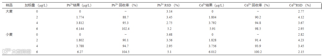 为进一步验证方法的可靠性,实验选取大麦和小麦两种实际样品,在3个不同浓度梯度(2、4、6 µg/L)下进行加标实验。通过加标回收率评估检测方法效果,并通过内标法进行测定。结果见表2,铅和镉的回收率在88.7%~104.5%之间,标准差范围在2.15%~5.2%(n=3)之间,表明该检测方法的精密度和准确性符合实验要求。与传统方法相比,该方法在低检测限下显示出较高的灵敏度和精密度。本研究所用的电化学传感器具有较低的设备成本,适用于现场快速检测,在资源有限或需要现场检测的情况下具有潜在应用价值。