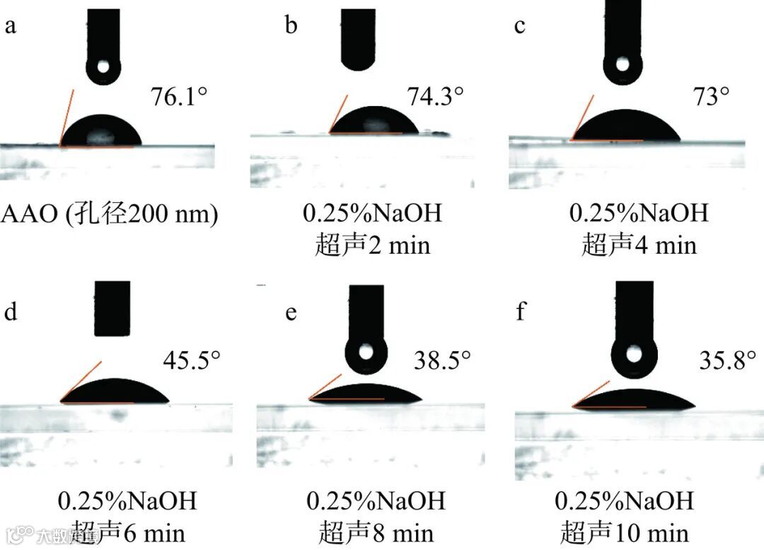 图 6 不同超声处理时间下AAO膜的水接触角变化