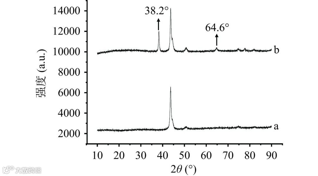 注:(a)原始AAO膜;(b)AuNPs-MWCNTs修饰后的AAO膜;箭头标记XRD图谱中的特征峰,位于38.2°和64.6°。