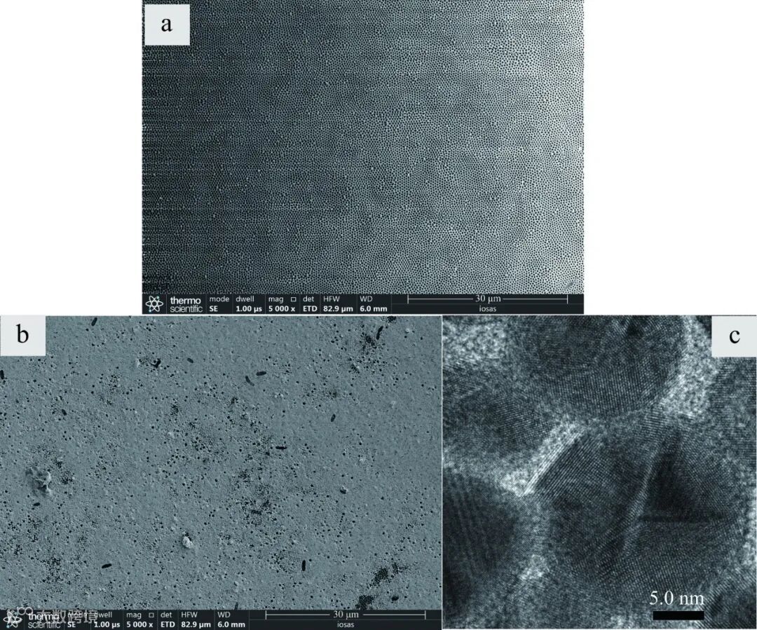 注:(a)原始AAO膜SEM图(5000×),(b)修饰后AAO膜SEM图(5000×),(c)AuNPs-MWCNTs复合材料TEM图(5 nm)。
