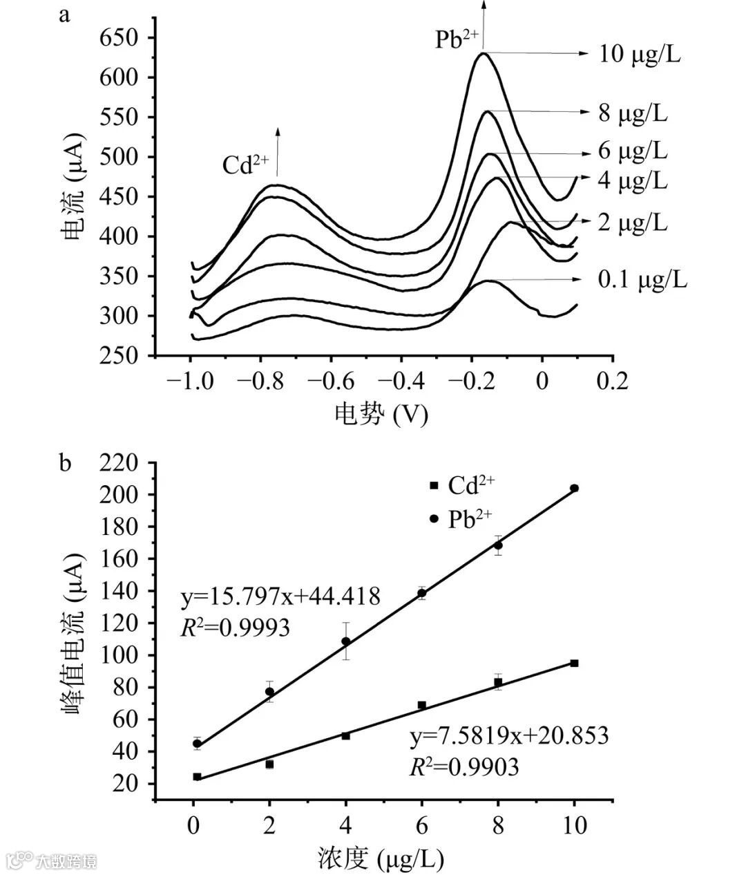注:(a)不同浓度Cd2+和Pb2+的SWSV曲线;(b)Cd2+和Pb2+峰电流与浓度的线性关系图。