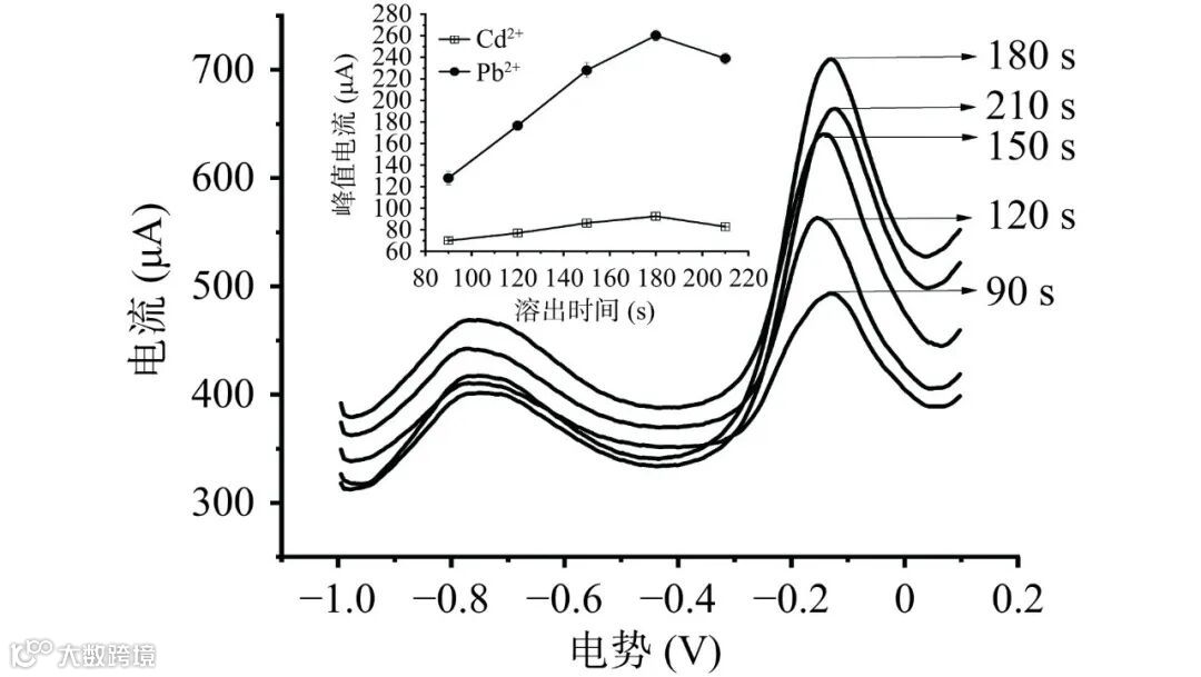 图9中展示了在不同溶出时间下,AuNPs-MWCNTs@AAO/Ag/SPCE电极对Cd2+和Pb2+的SWSV响应。随着溶出时间从90 s增加到210 s,电流峰值呈现先增大后减小的趋势,最大峰值出现在180 s时,表明在此溶出时间下,电极对目标离子的电化学反应最为有效。插图描绘了Cd2+和Pb2+峰电流随溶出时间的变化趋势。Pb2+的峰电流在180 s时达到最大值,而Cd2+的峰电流在不同溶出时间下变化相对平缓,在180 s处出现最高值。在210 s时,电流下降可能是由于溶出时间过长,导致析出离子重新溶解或电极表面被其他副产物覆盖,从而降低了检测灵敏度。这表明在180 s的溶出时间条件下,电极对Pb2+和Cd2+具有最佳的检测灵敏度和选择性。