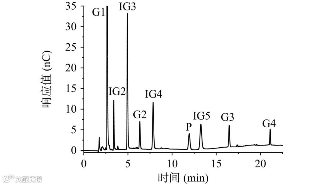 注:G1:葡萄糖;G2:麦芽糖;G3:麦芽三糖;G4:麦芽四糖;IG2:异麦芽糖;P:潘糖;IG3:异麦芽三糖;IG4:异麦芽四糖;IG5:异麦芽五糖。