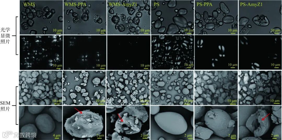 图 3 原淀粉及其 α-淀粉酶水解后淀粉的光学显微形貌及 SEM 图