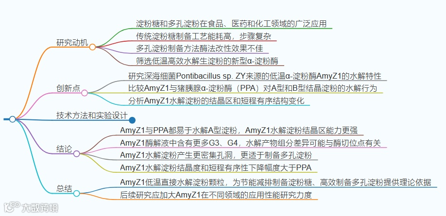 研究显示两种-淀粉酶在相同条件下,AmyZ1在低温下对A型结晶淀粉WMS的水解能力更强,水解率高于PPA,且生成的较长链葡聚糖含量更高。AmyZ1对淀粉颗粒的结晶结构破坏更大,表现出更低的焓值和热转变温度。这些发现为AmyZ1在低温下直接水解淀粉颗粒的应用提供了理论依据,并建议进一步研究其在不同领域的应用性能。