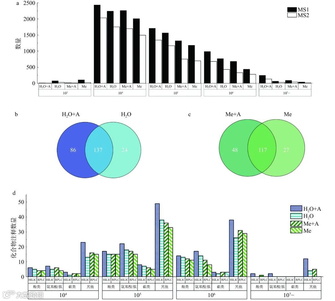 采用Upset图(图1c)分析芒果浆中共有和特有的组分。在HILIC模式下,H2O+A组与H2O组共有的MS1数量为7542个,分别占各自总MS1数量的93.68%和85.31%;H2O组和H2O+A组特有的MS1数量分别为509个和1299个。在RPLC模式下,Me组和Me+A组共有的MS1数量为3355个,分别占各自总MS1数量的89.95%和81.51%;375个MS1仅出现在Me组,761个MS1仅出现在Me+A组。研究结果表明,提取溶剂中添加0.1%乙酸有助于增加MS1的采集数量,尤其是在104以上的区间内,而在103区间内则表现出一定的抑制作用。