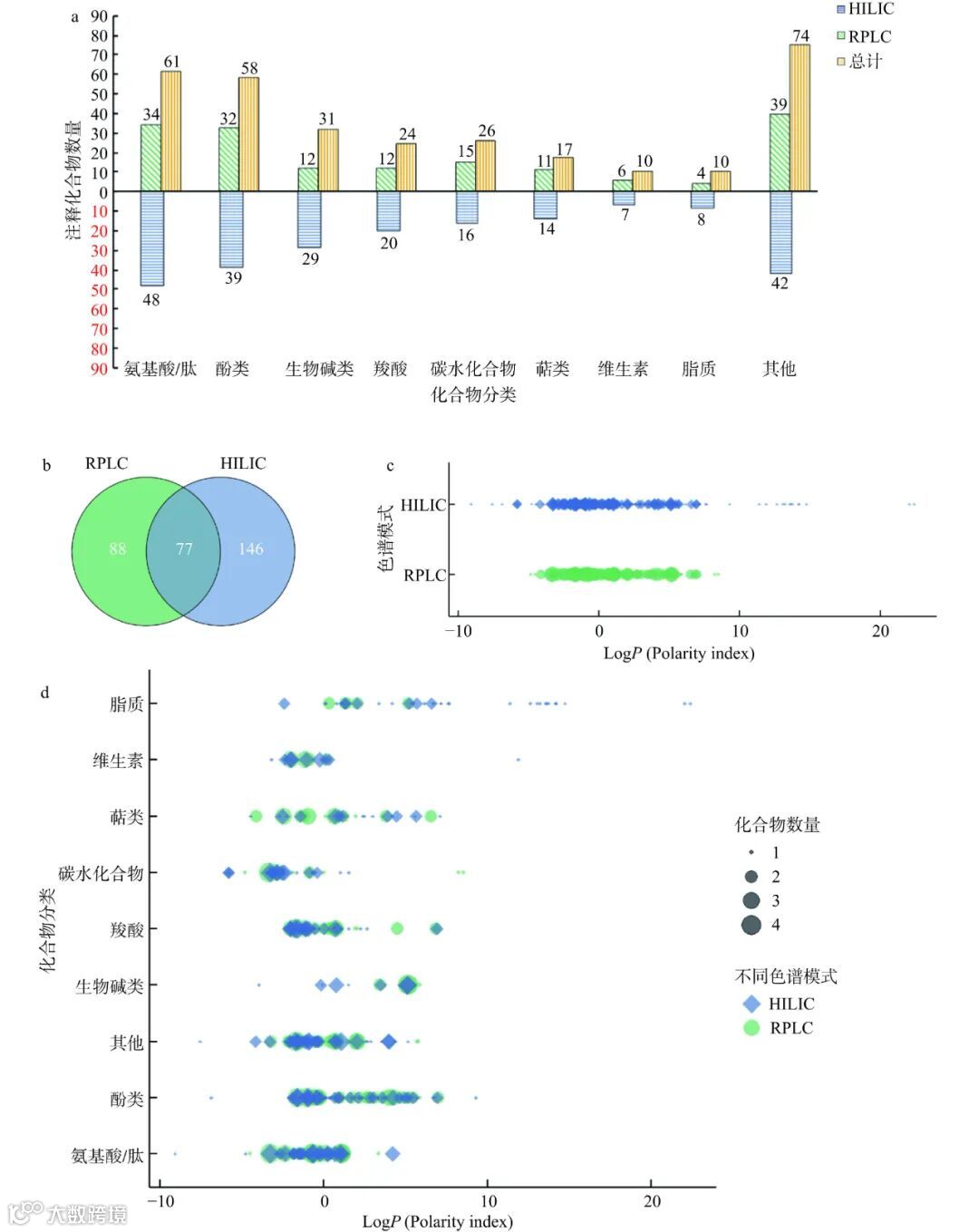 注:a:各类注释组分的数量;b:韦恩图;c:注释组分极性范围;d:各类组分极性分布;当有多个组分极性一致时,标志物根据数量多少依次变大。