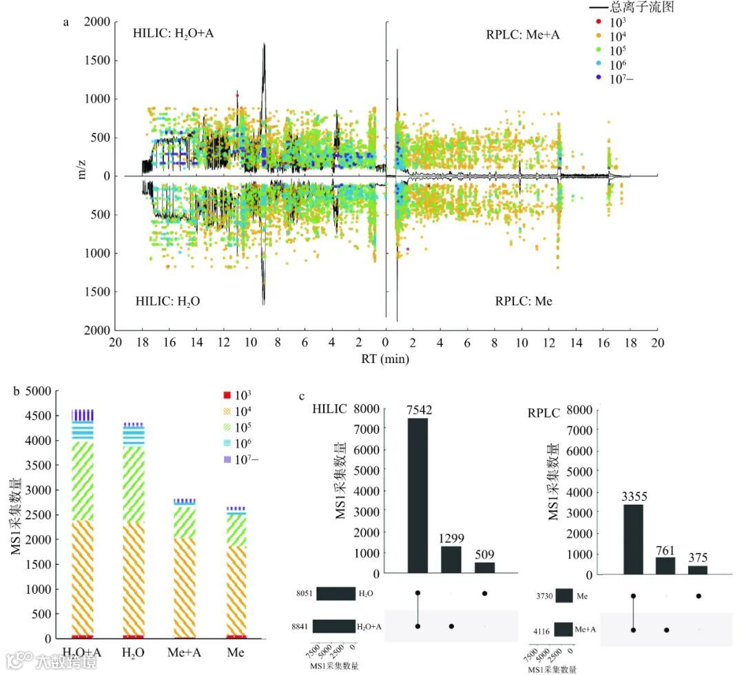 综上所述,与H2O组和Me组相比,H2O+A组和Me+A组可以采集到更多、响应更高的MS1以及更加干净的MS2,得到的定性代谢物的覆盖率和极性范围更广。因此采用(H2O+A)+HILIC与(Me+A)+RPLC作为最佳方案进行后续研究。
