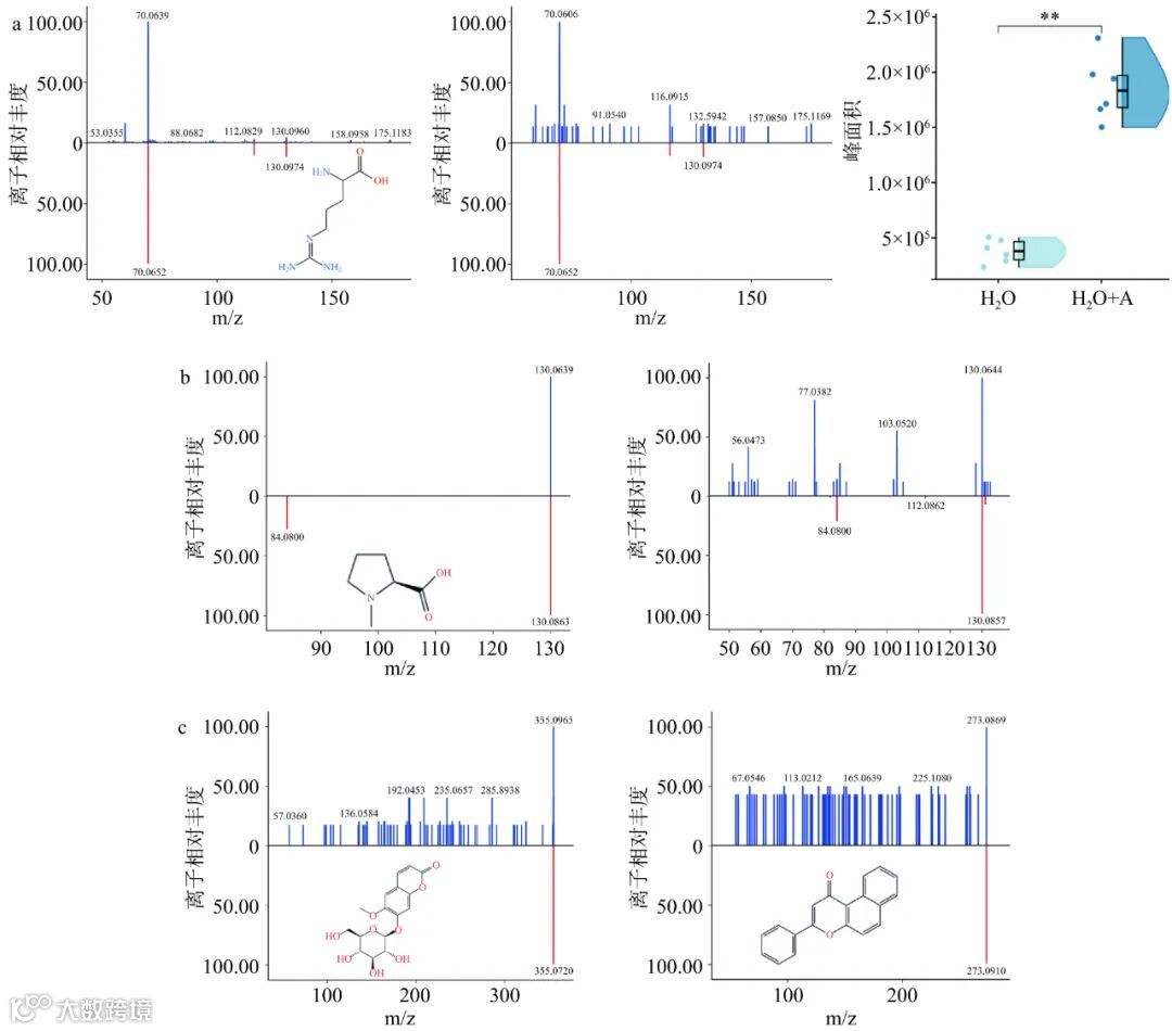注:a:H2O+A(左)和H2O(右)组共有组分7-O-甲基芒果苷的镜像图和峰面积对比;b:H2O+A组特有组分N-甲基-L-脯氨酸在H2O+A(左)和H2O(右)组的镜像图;c:仅在H2O+A组(左,东莨菪苷)/H2O组(右,β-萘基黄酮)注释到的特有组分;**表示T检验P<0.01,表明结果具有统计显著性;图5同。