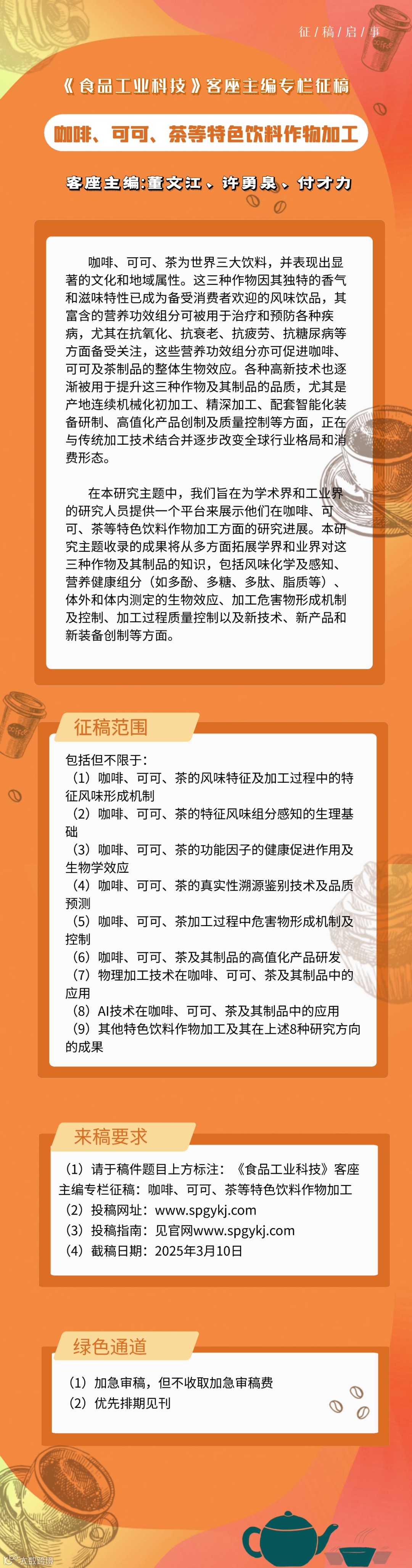 《食品工业科技》青年编委专栏征稿:咖啡、可可、茶等特色饮料作物加工 ☚
