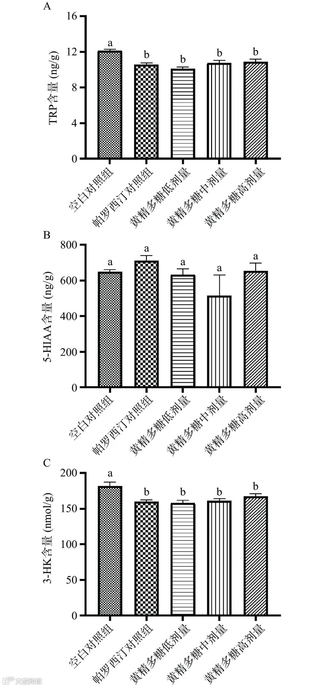 图 5 黄精多糖对小鼠海马中色氨酸代谢的影响(Mean±SD,n=12)