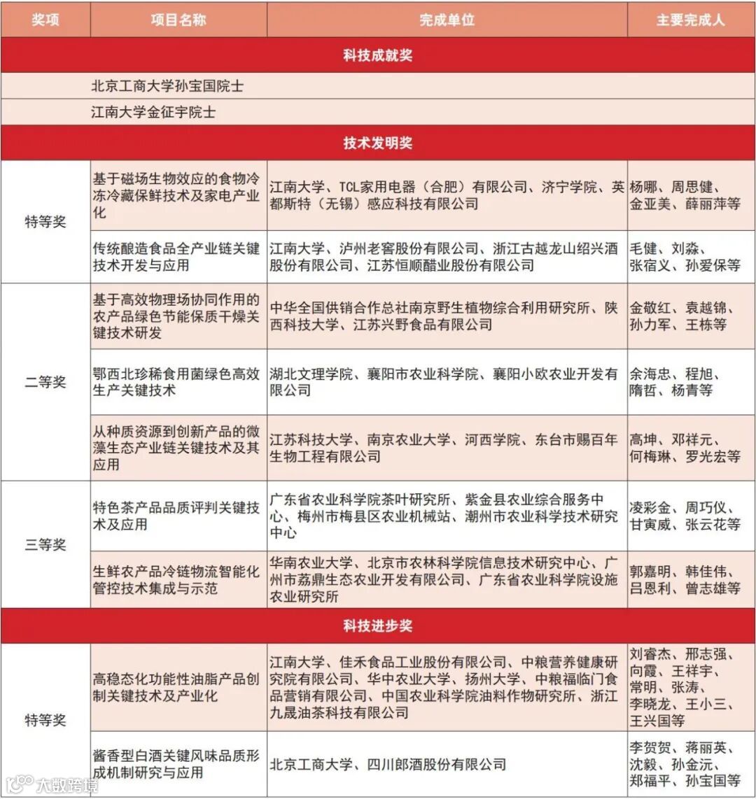 2023年度国家科技技术奖结果,其中涉食品领域的学者获得国家科学技术奖励的如下: