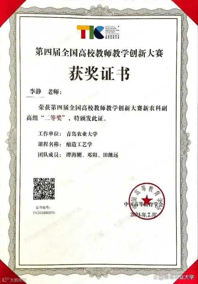 青岛农业大学食品科学与工程学院李静副教授团队在第四届全国高校教师教学创新大赛上获得新农科副高组二等奖。