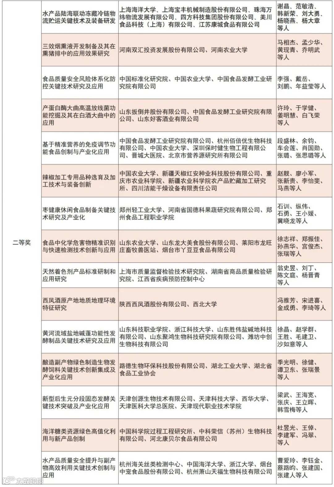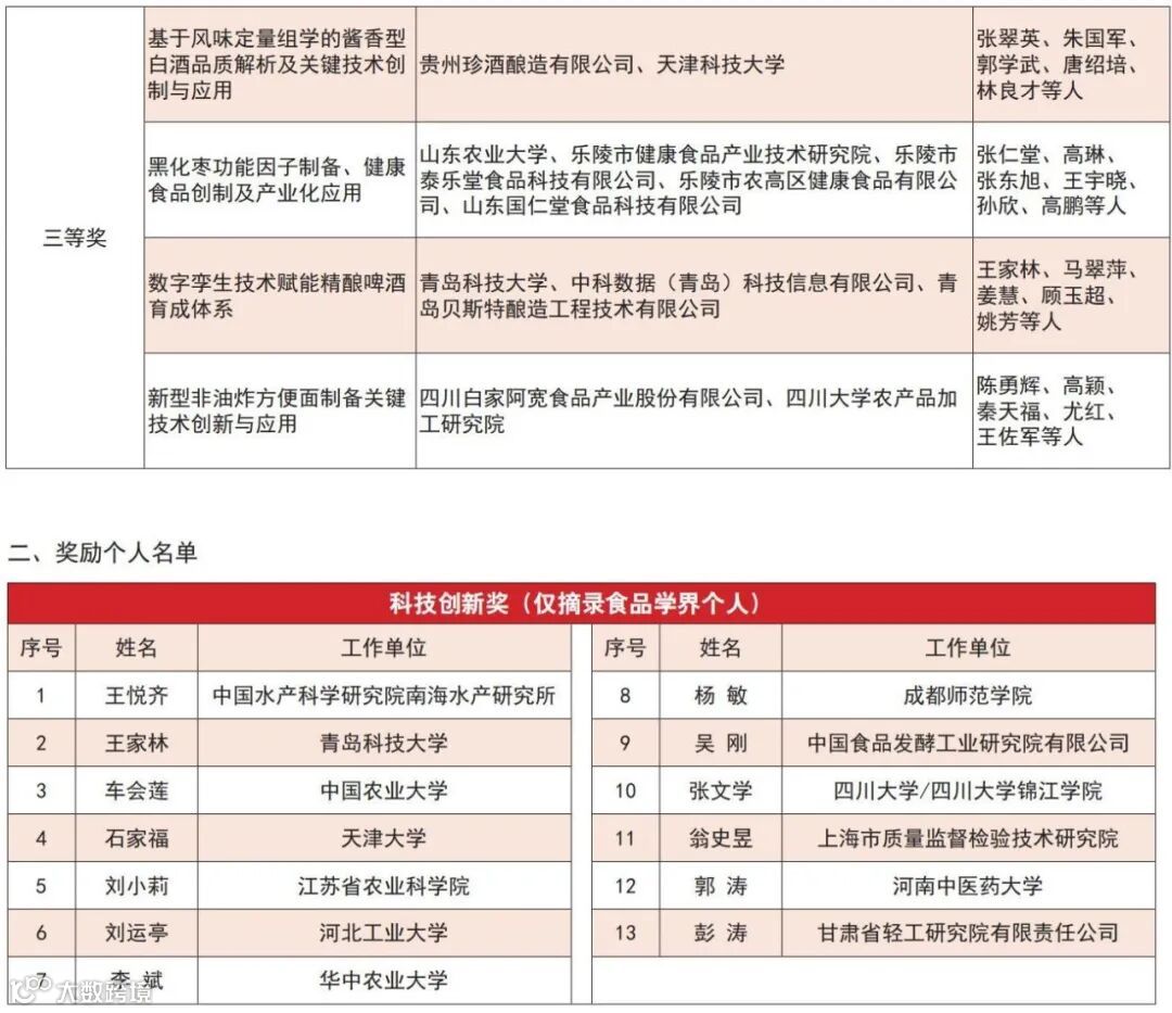 12月16日在北京开幕的第二十二届中国食品安全大会暨2024全国食品工业科技进步大会上,获得2023 年度“中国食品工业协会科学技术奖”奖励项目和个人名单如下: