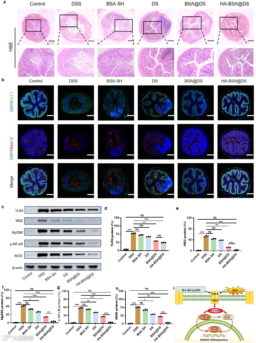 作者通过H&E染色进行组织病理学检查,BSA@DS和HA-BSA@DS干预改善了这些组织学畸变,后者显示出更好的治疗效果。随后的免疫荧光分析进一步证实了HA-BSA@DS组中ZO-1和Muc2表达的显著增加。此外,DSS处理组的TLR4/MD2/MyD88/NF-κB/iNOS的蛋白表达明显上调。相比之下,HA-BSA@DS治疗大大降低了这些升高,显示出优于其他治疗方法的疗效。