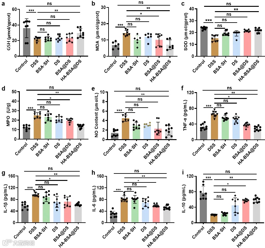 作者进一步研究了HA-BSA@DS在体内调节氧化应激和炎症反应的作用,结果显示MDA降低,SOD和GSH水平升高。同时,DSS诱导的UC小鼠结肠组织中炎症介质(MPO、NO、TNF-a、IL-1β和IL-6)水平的加剧。HA-BSA@DS治疗减少了这些炎症激增,同时增强了抗炎反应。