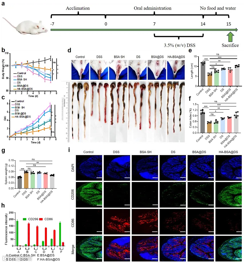 为了评估HA-BSA@DS在UC模型中的治疗潜力,作者通过疾病活动指数(DAI)量化的疾病严重程度进一步证实了HA-BSA@DS的优越疗效,HA-BSA@DS组结肠长度明显延长,而BSA@DS组和DS组没有明显的增强。接着作者探索了结肠组织内巨噬细胞极化动力学。DSS组表现出M1表型增加(以CD86表达表示)和M2表型减少(以CD206水平降低为标志)。HA-BSA@DS组证明了一种范式转变,CD206的大幅上调和CD86的同时下调,高度揭示了其对体内巨噬细胞表型转变的强大调节作用。