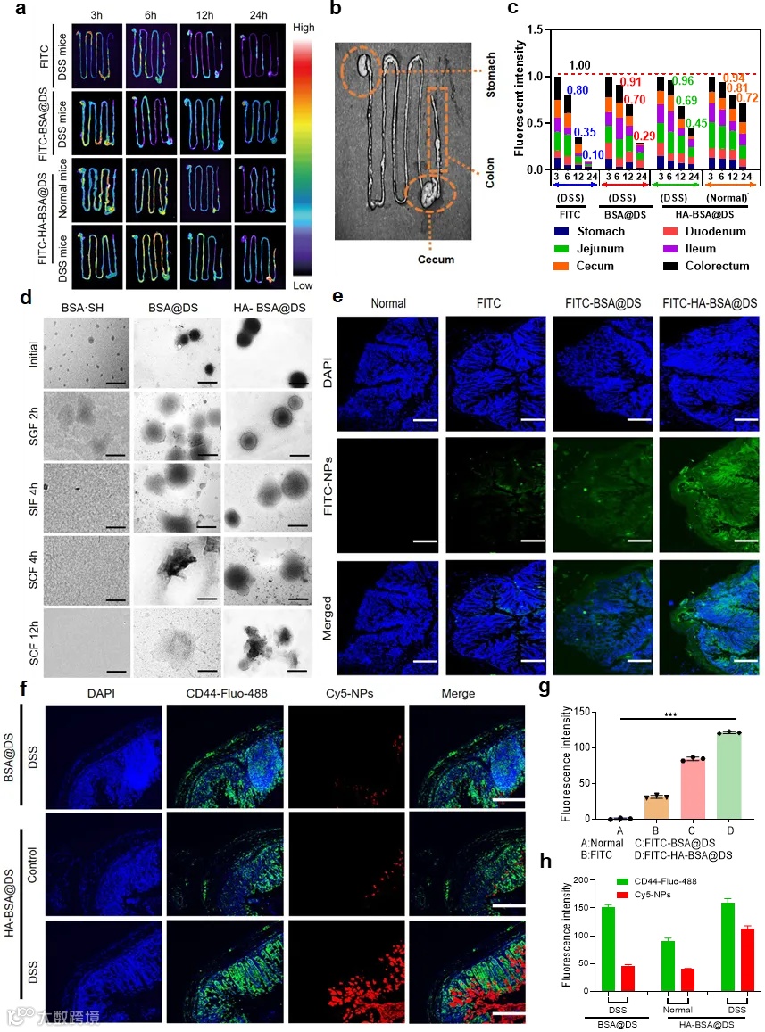 为了评估生物分布和体内炎症靶向能力和HA-BSA@DS纳米颗粒对炎症结肠组织的靶向效率,对结肠组织进行了免疫荧光分析,结果显示HA-BSA@DS组比其他组表现出更强的绿色荧光信号。此外,HA-BSA@DS组的荧光强度明显高于游离FITC组和BSA@DS处理组,分别提高了6.3倍和2.6倍。这些发现表明,序列靶向纳米颗粒对结肠炎组织中的炎症区域表现出极好的选择性。