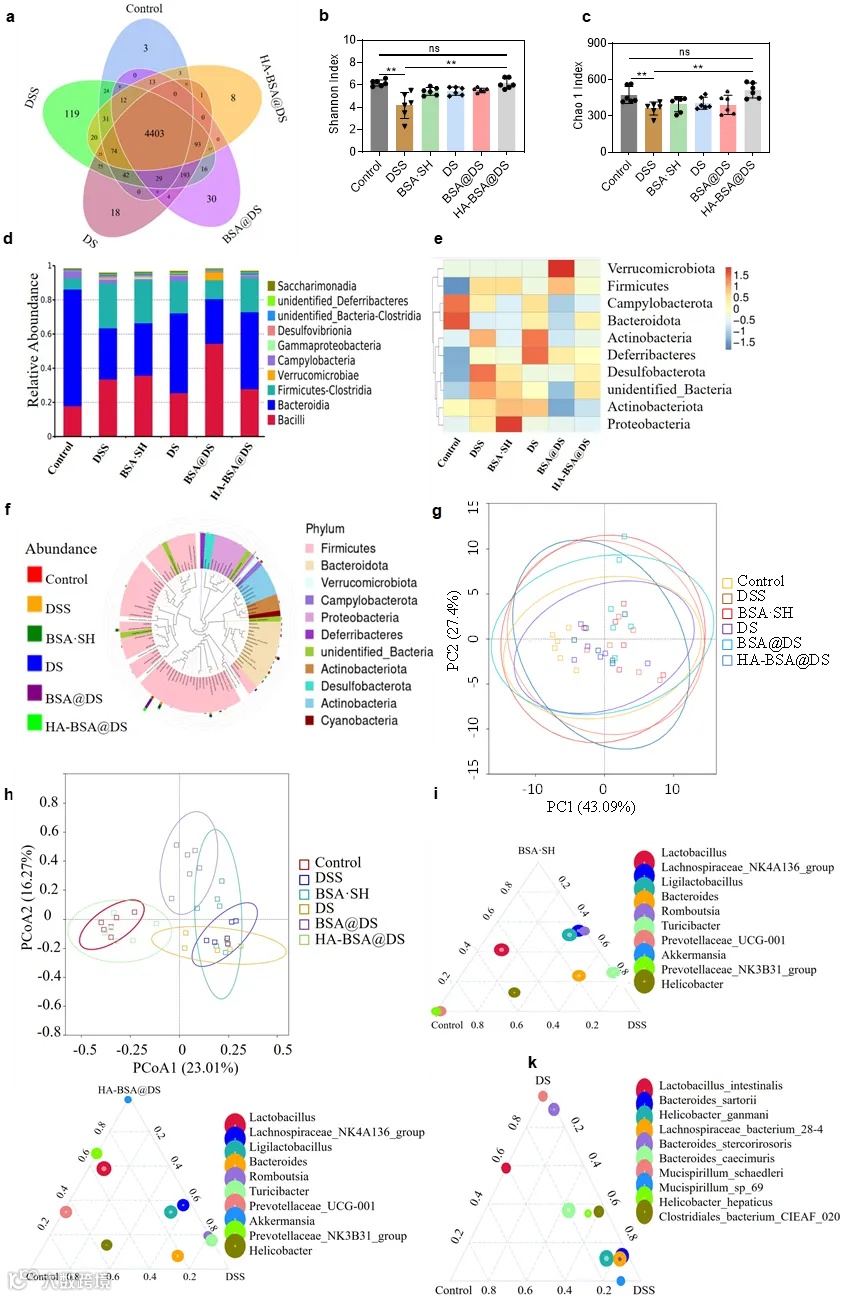 鉴于HA-BSA@DS的免疫调节作用,假设其干预重塑DSS挑战结肠内的微生物环境。作者为了探索这一点,对不同处理小鼠的粪便标本进行了16S rRNA测序。发现HA-BSA@DS在调节和恢复DSS引起的微生物失衡方面表现出显著的潜力,为治疗UC提供了一种有希望的干预策略。