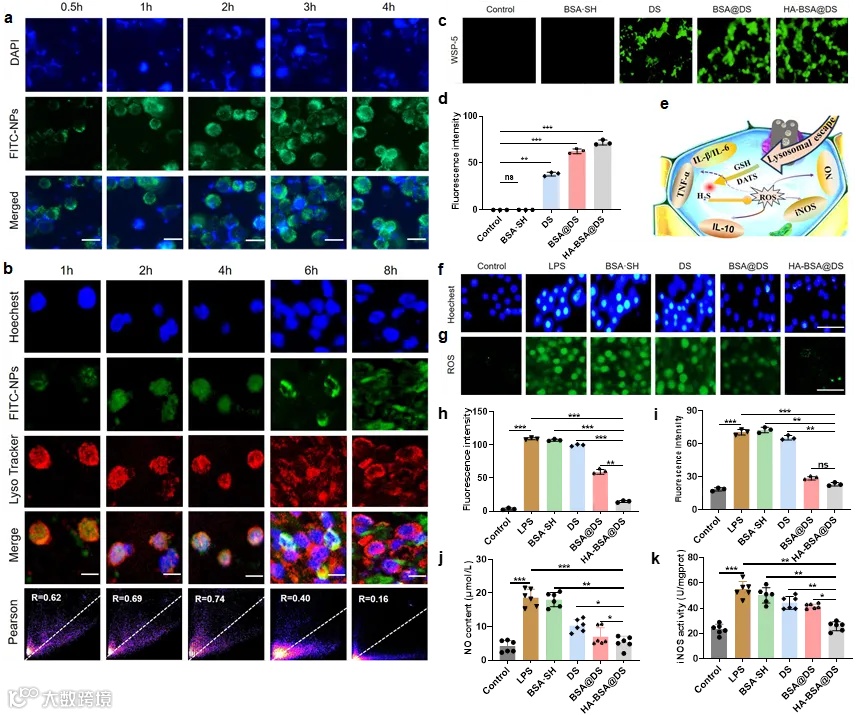 作者将异硫氰酸荧光素(FITC)与HA-BSA偶联,以评估ha修饰的纳米颗粒通过CD44受体对巨噬细胞的特异性,并利用LysoTracker Red探针评估了溶酶体逃逸的能力,以及利用荧光探针WSP-5监测RAW264.7细胞中H2S的产生。