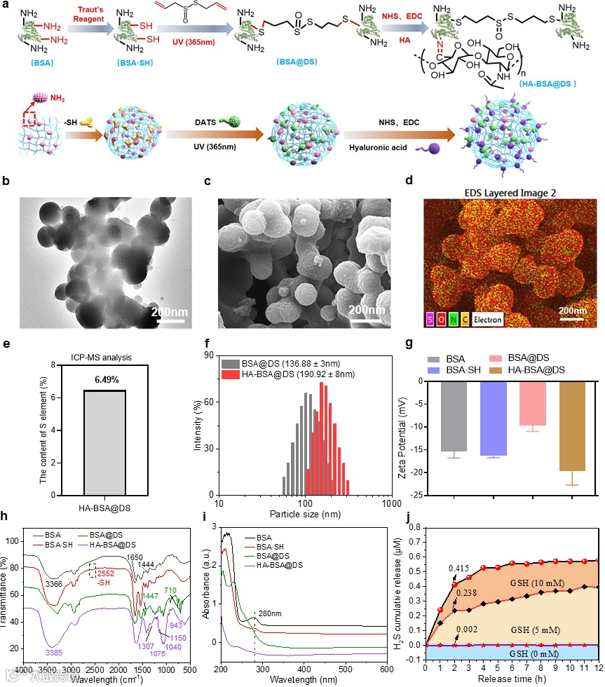 作者将巯基牛血清白蛋白(BSA⋅SH)与硫代亚磺酸二烯丙基(DS)偶联。随后与透明质酸(HA)脱水缩合得到HA-BSA@DS纳米颗粒,并对该纳米颗粒进行表征。