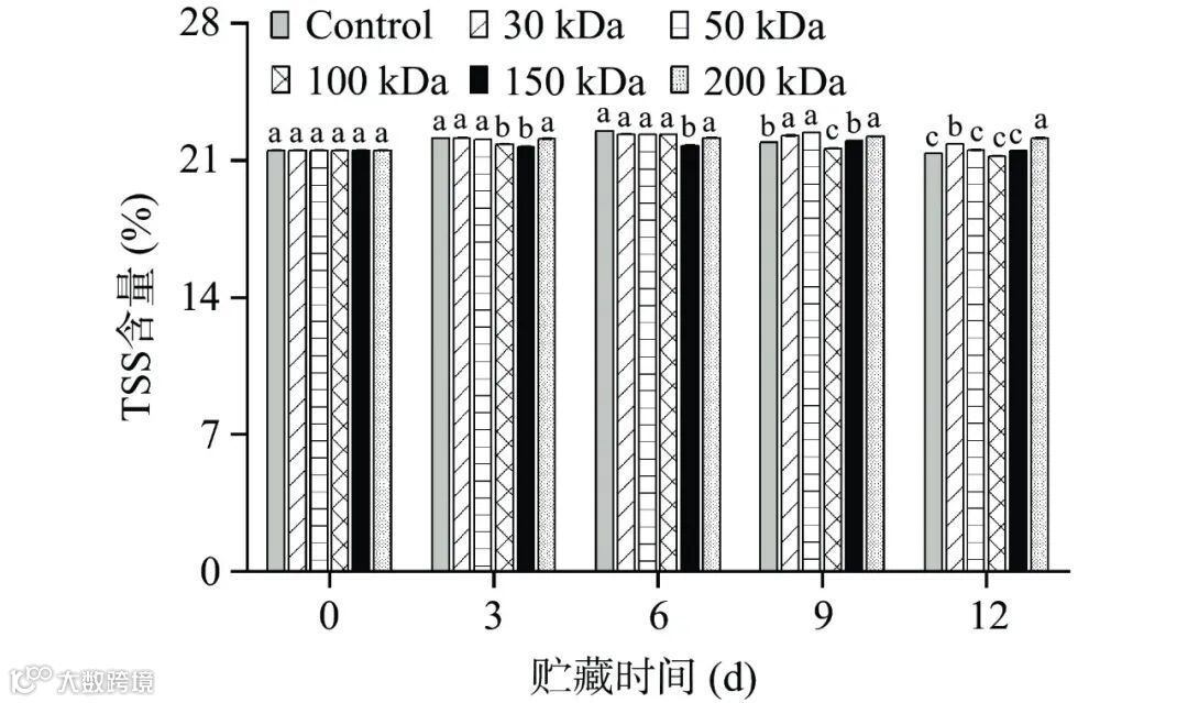 Figure 5. Effect of chitosan coating with different molecular weights on the content of TSS in postharvest passionfruit during storage