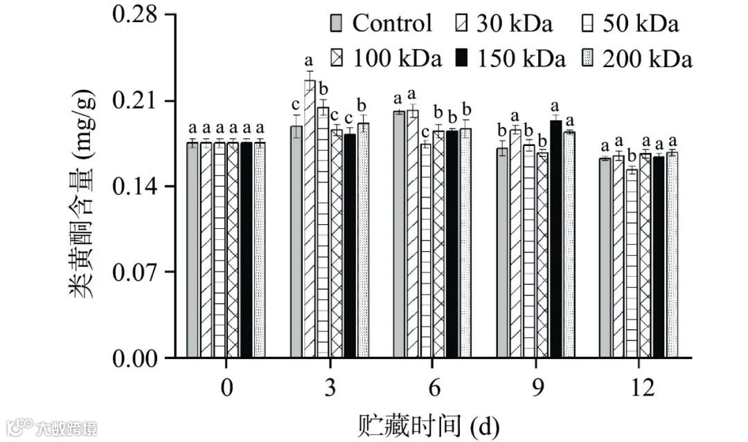 图 9 不同分子量壳聚糖涂膜对采后西番莲果实贮藏期间类黄酮含量影响