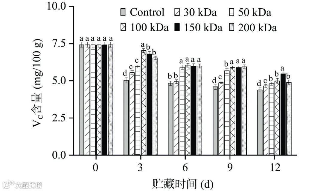 Figure 8. Effect of chitosan coating with different molecular weights on the content of VC in postharvest passionfruit during storage