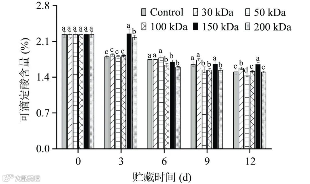 图 6 不同分子量壳聚糖涂膜对采后西番莲果实贮藏期间可滴定酸含量影响