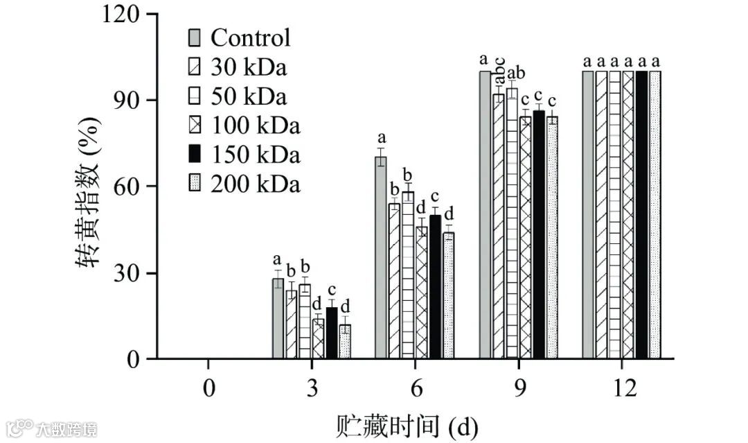图 3 不同分子量壳聚糖涂膜对采后西番莲果实贮藏期间转黄指数影响