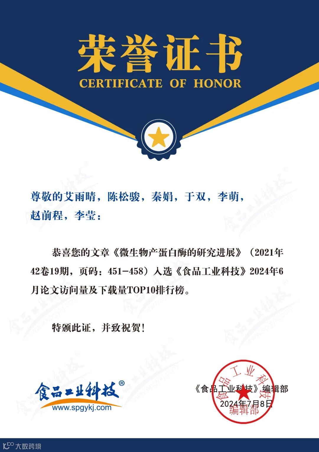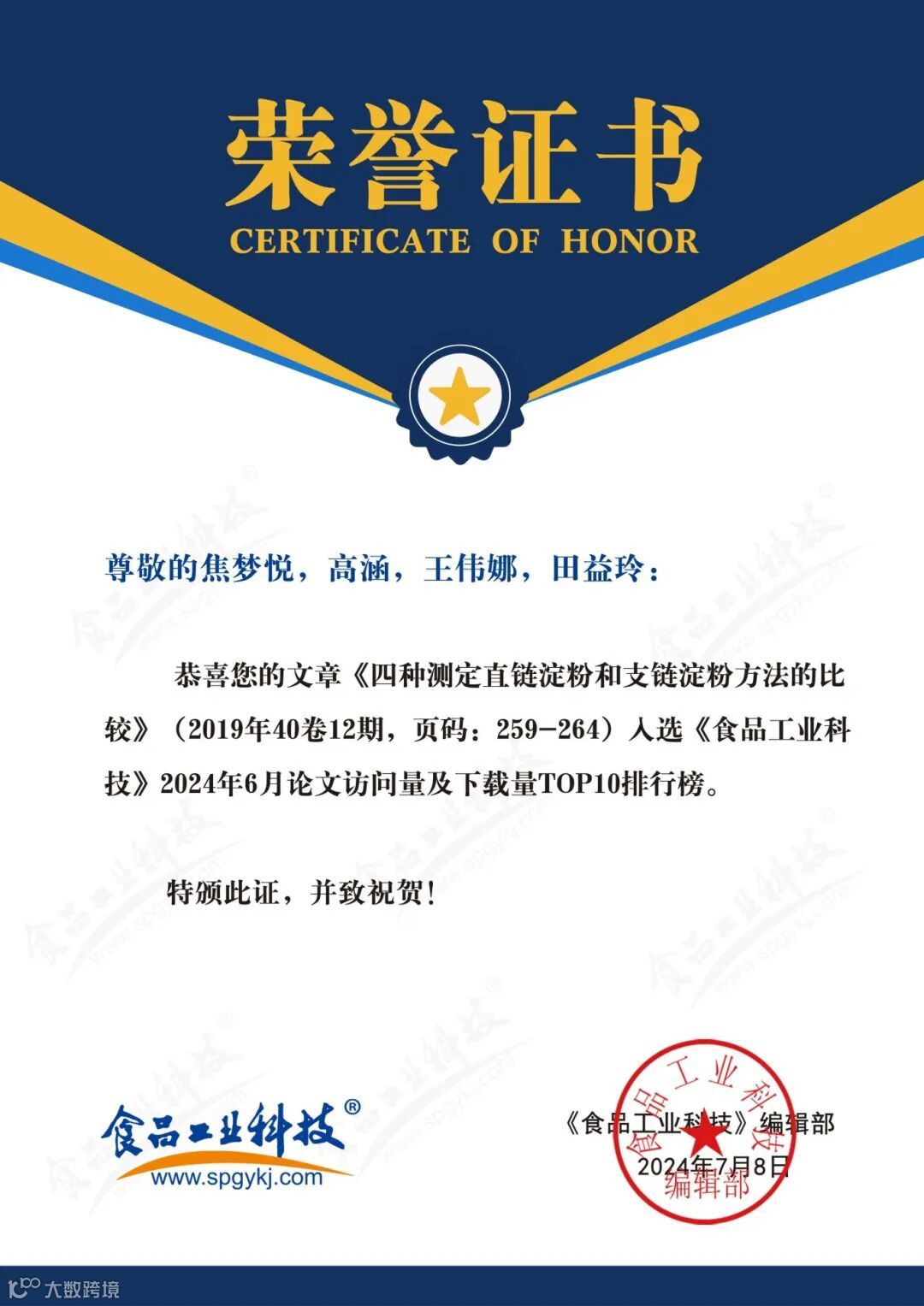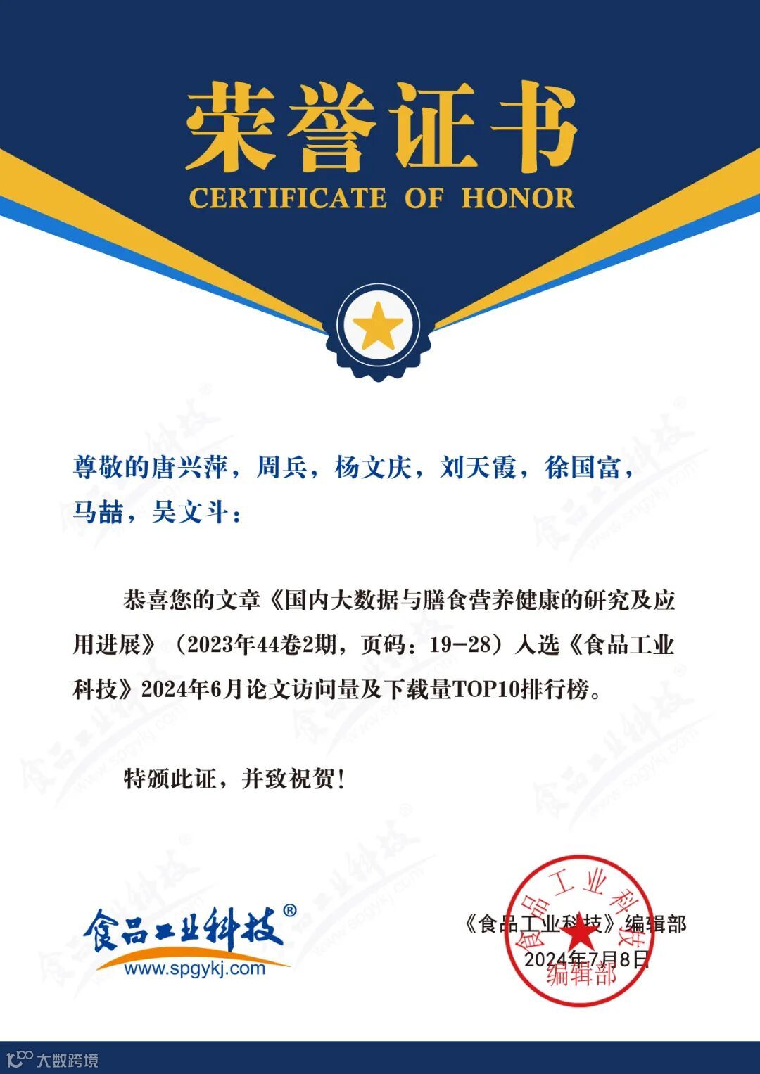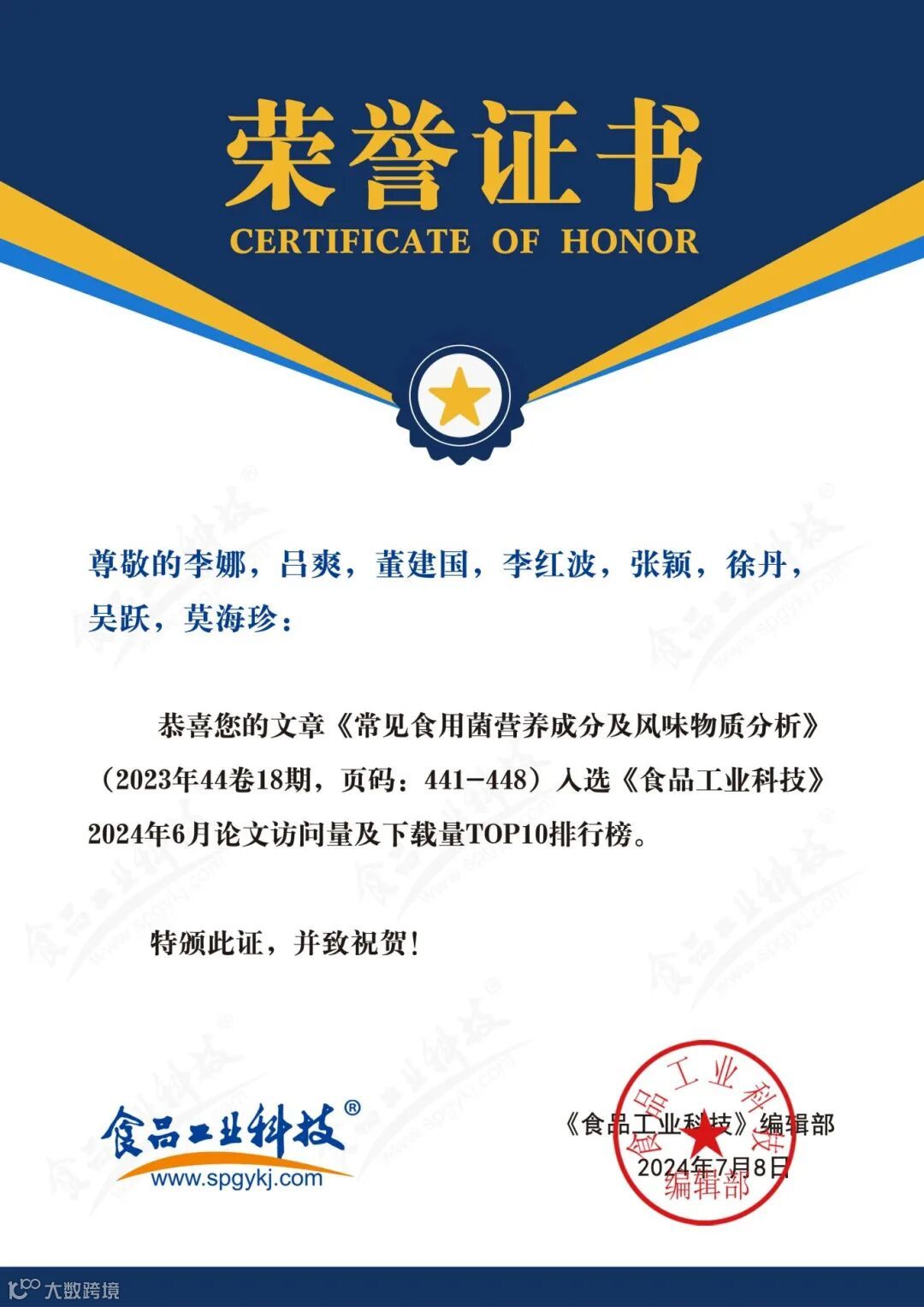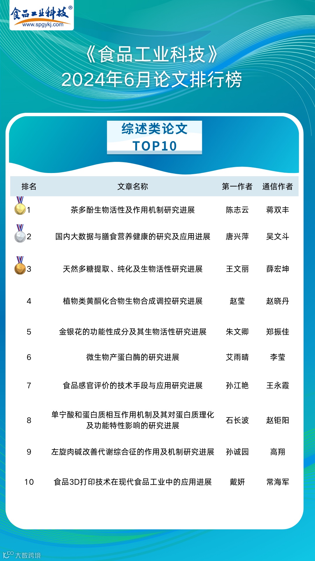2024年6月起,《食品工业科技》编辑部每月将会公布上个月的文章下载量排行榜。《食品工业科技》将坚守办刊宗旨,秉承严谨细致、精益求精的工作态度,肩负时代赋予的社会责任,稳中求进、奋楫争先,为推动我国食品领域的发展做出更多贡献。