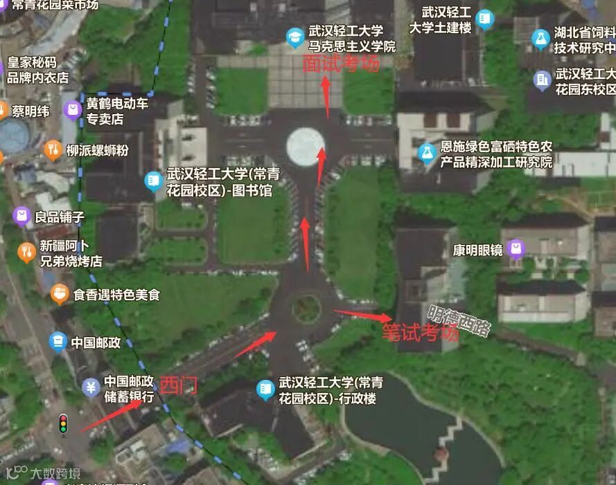 面试、笔试和加试地点均在武汉轻工大学常青校区(如下图红色箭头指引),具体考场安排以现场指示及线上通知为准。请第一志愿考生实名申请(姓名+报考专业+分数)加入QQ群:438228546,入群后将群名片改为“报考专业+姓名”, 后续工作安排将统一在群内通知。以上为一志愿复试安排,调剂复试另行公告通知。