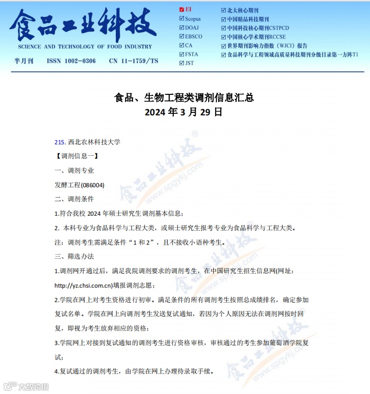 《食品工业科技》免费发布高校调剂信息,联系方式VX:17746598288,邮箱:bianjishuang@spgykj.com