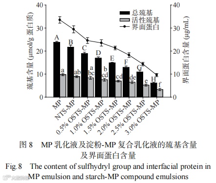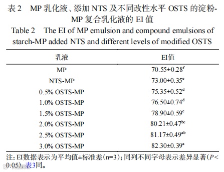 In order to improve the hydrophobicity of tapioca starch, and used it as a granular emulsifier to improve the emulsification properties of myofibrillar protein (MP). In this study, a hydrophobic modification of native tapioca starch (NTS) by octenyl succinate anhydride (OSA), which produced ocentyl succinic tapioca starch (OSTS) with different modification levels and degrees of substitution (DS), and the compound emulsions were prepared using OSTS and MP. The structural changes of the OSTS were analyzed by XRD, FT-IR, SEM, and PLM, and the emulsion index (EI), emulsifying activity index (EAI), emulsion stability index (ESI), Zeta-potential, particle size distribution, sulfhydryl content, and interface protein content of the emulsions were determined. The results showed that the hydrophobic groups were successfully introduced in the tapioca starch molecules, and the hydrophobic modification treatment had basically no effect on the crystal structure type of the tapioca starch particles. The EAI and ESI of the OSTS-MP compound emulsions improved significantly (P<0.05) with increased starch modification levels and DS values, which of the 3.0% OSTS-MP compound emulsion had the best stability. The interaction of starch and MP in the compound emulsion impacted on the spatial structure of MP, both of them had a competitive adsorption effect at the emulsion droplet interface, and which of these were enhanced with modification levels and DS values. The results obtained provided a theoretical basis for the application of OSTS in emulsified comminuted meat products.